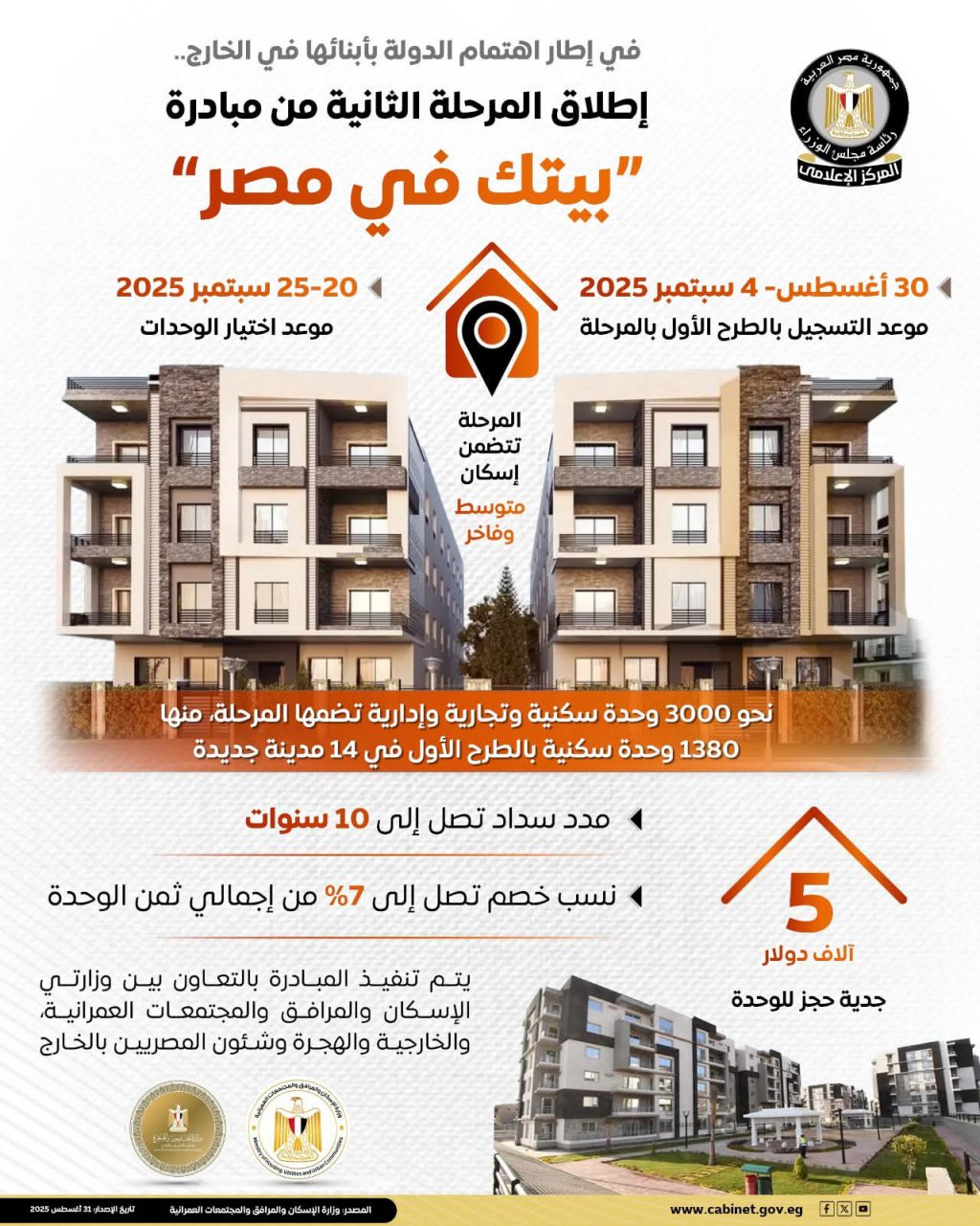 في إطار جهود الدولة لتعزيز ارتباط المصريين بالخارج بالوطن ودعم مشاركتهم في مسيرة التنمية الشاملة،تطلق الدولة المرحلة الثانية من مبادرة “بيتك في مصر”، والتي تقدم حزمة من التيسيرات والمزايا للمغتربين تشمل إجراءات ميسرة للحجز والسداد.